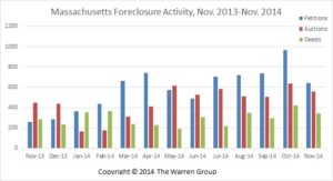 Boston, Dec. 29, 2014- Foreclosure petition activity in the Bay State posted big gains in November, climbing up by 150.0 percent year-over-year, according to The Warren Group, publisher of Banker & Tradesman.